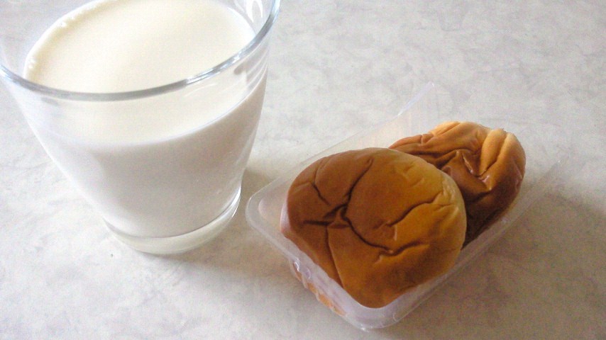 ヤマザキ 薄皮ピーナッツパン2個/牛乳(グラス)/すもも2個