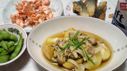 ツバスのから揚げ/じゃがいものきのこチーズかけ/サラダ油/えだ豆/サッポロ ドラフトワン350ml×2本