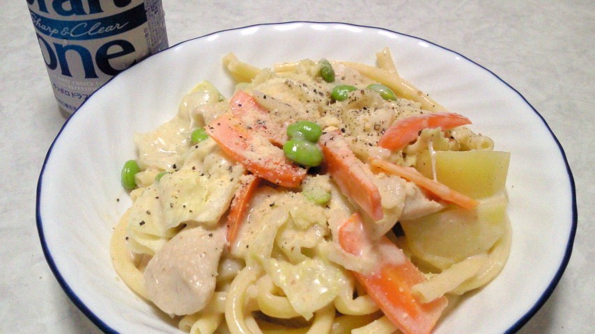 ささみのクリームパスタ/冷やっこ/焼きちくわ/サッポロ ドラフトワン350ml×2本/煎茶