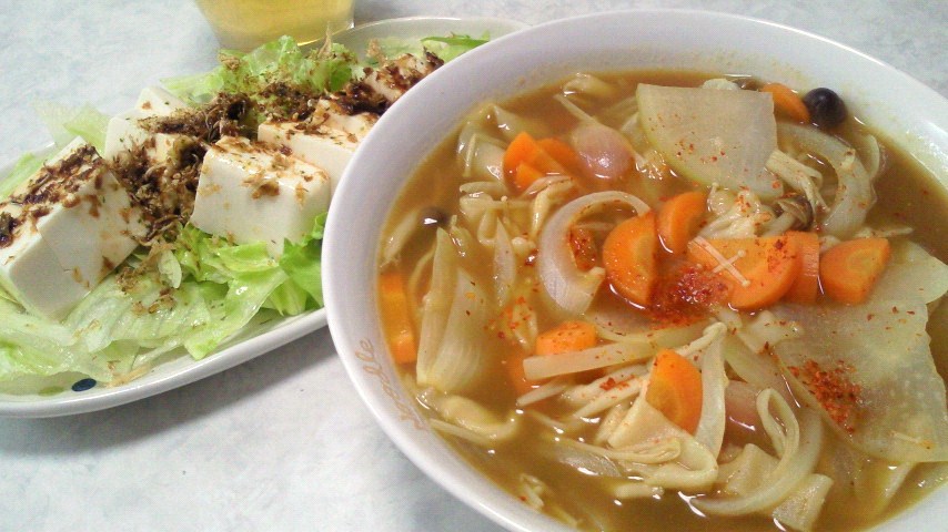 カレーうどん/豆腐サラダ/キャベツの千切り/煎茶