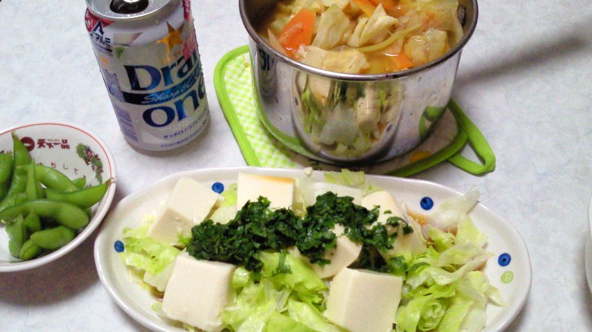 カレー鍋/冷やっこ/レタス/えだ豆/リゾーニ/牛乳(グラス)/スライスチーズ/