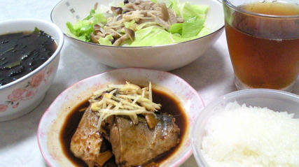 ご飯/ツバスの味噌煮/きのこの白ワイン蒸し/味噌汁(わかめとみつばの赤だし)/のりの佃煮