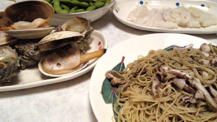 焼きはまぐり/いかの刺し身/さざえのつぼ焼き/えだ豆/ペペロンチーニスパゲッティ/