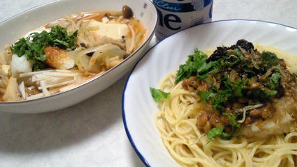サッポロ ドラフトワン350ml/納豆おろしスパゲッティ/きのこのあんかけ豆腐