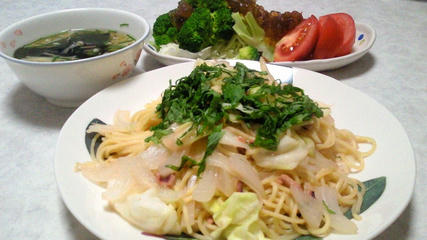 ペペロンチーニスパゲッティ/わかめのコンソメスープ/トマト/