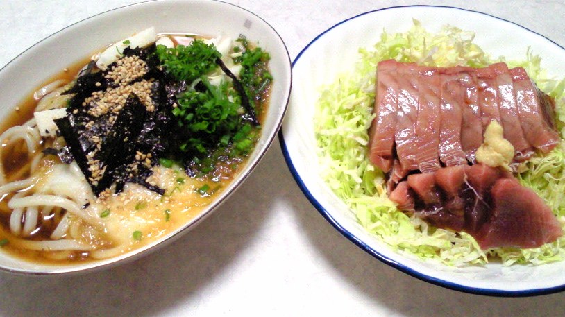 ぶっかけうどん/かつおの刺し身/キャベツの千切り/マヨネーズ