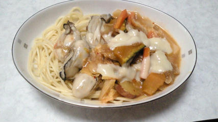 牡蠣キムチパスタ 775kcal