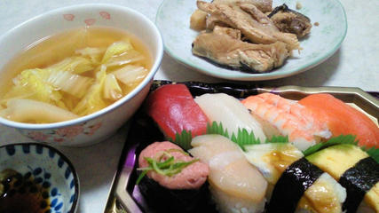 にぎり寿司盛り合わせ/白菜とくずきりのスープ/ぶりのあら煮/