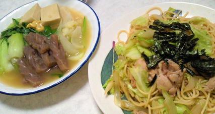 鶏肉とキャベツのペペロンチーニスパゲッティ/高野豆腐の炊き合わせ
