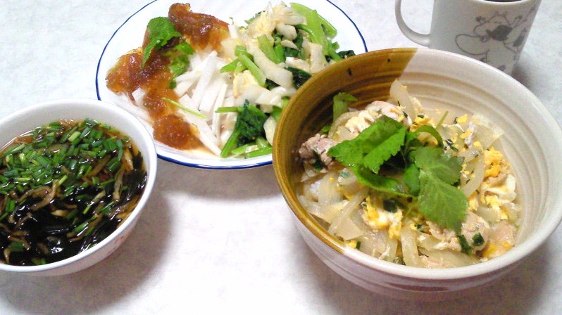 親子丼/小松菜のごま和え/切干し大根の味噌汁/大根のサラダ/のりの佃煮