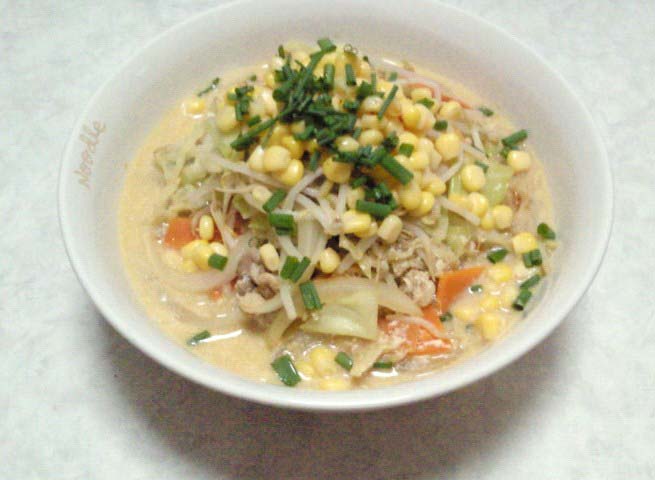 ホールコーン55g、もやし100g、人参25g、ねぎ10g、豆乳120g、