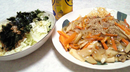 皿うどん/納豆/キャベツの千切り/焼きのり/KIRIN のどごし生500ml