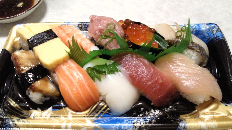 にぎり寿司(まぐろ卵焼き・えび・いくら・さけ)/押し寿司(あなご)/