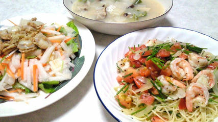 海老とトマトのカッペリー二/きのこのミルクスープ/ホタテ貝と大根と人参と水菜のサラダ