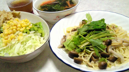 パスタは55g。えのき茸50gでかさ増しです。