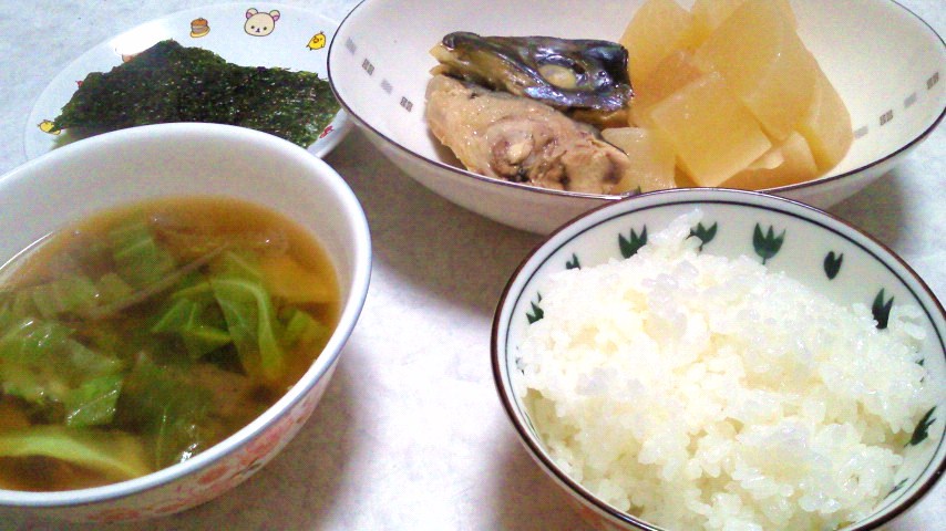 ご飯/ぶり大根/味噌汁(キャベツとこんにゃく)/焼きのり