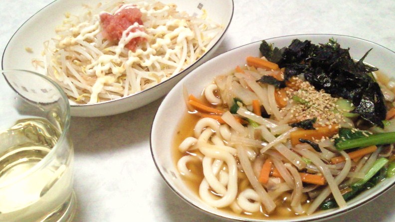 野菜あんかけうどん/もやしのおひたし(明太マヨ)/梅酒/みかん