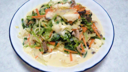 キャベツ120g、人参35g、玉ねぎ25g、サラダ油4g、ミックスチーズ10g、