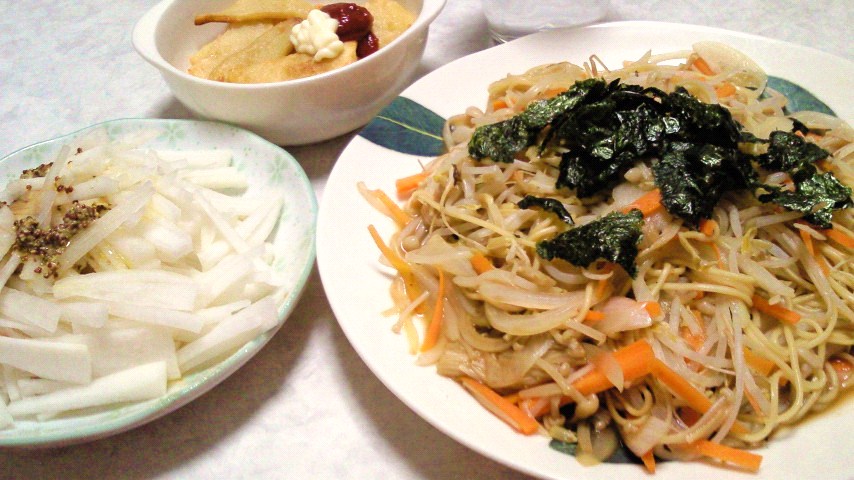 豚骨焼きラーメン/大根のサラダ/フライドポテト