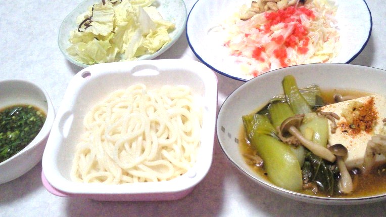 つけめん(うどん)/豆腐のひき肉あんかけ/キャベツと玉ねぎのサラダ/白菜の塩漬け