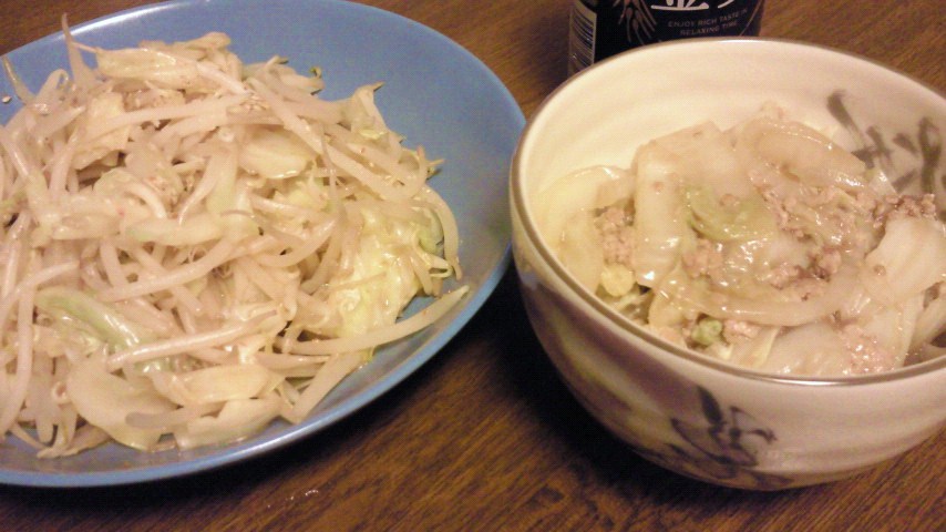もやしとキャベツの炒め物/豚と白菜の煮物/はまちの刺し身