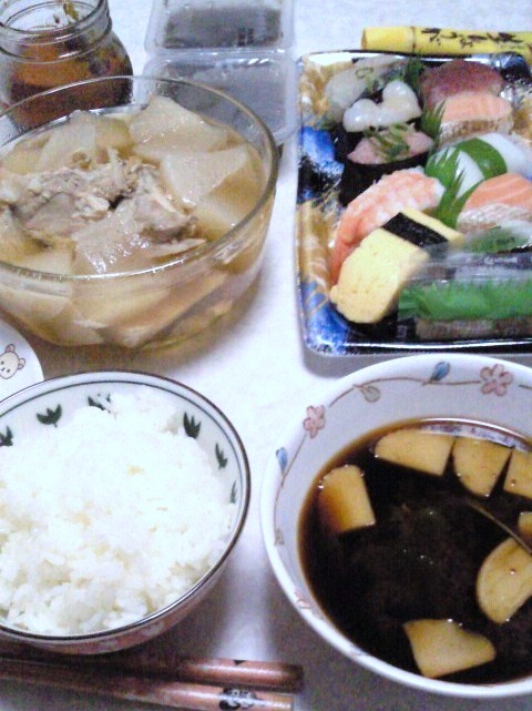 ご飯/のりの佃煮/ぶり大根/味噌汁(みつばとかまぼこの赤だし)/