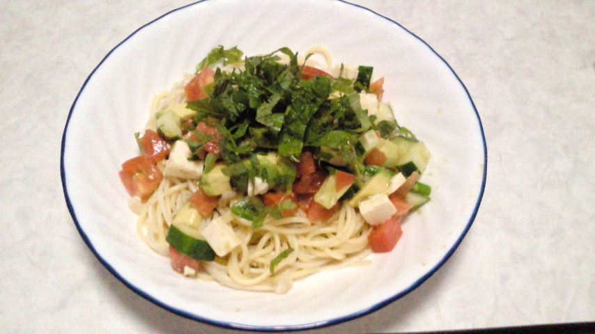 スパゲッティ50g、えのき70g、アボカド2分の1個、トマト120g、豆腐70g、きゅうり50g、
