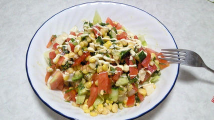 トマト100g、レタス80g、ホールコーン75g、きゅうり50g、マヨネーズ、酢