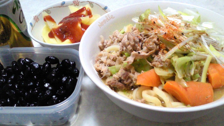 味噌煮込みうどん/じゃがいもチーズ/黒豆の煮豆/アサヒ オフ 350ml