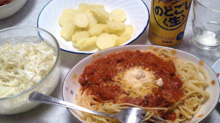 トマトスパゲッティ/コールスロー/じゃがいも/KIRIN のどごし生500ml×2本