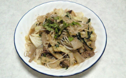もやし100g、キャベツ130g、えのき40g、しそ、ゴマ油、にんにく、調味料