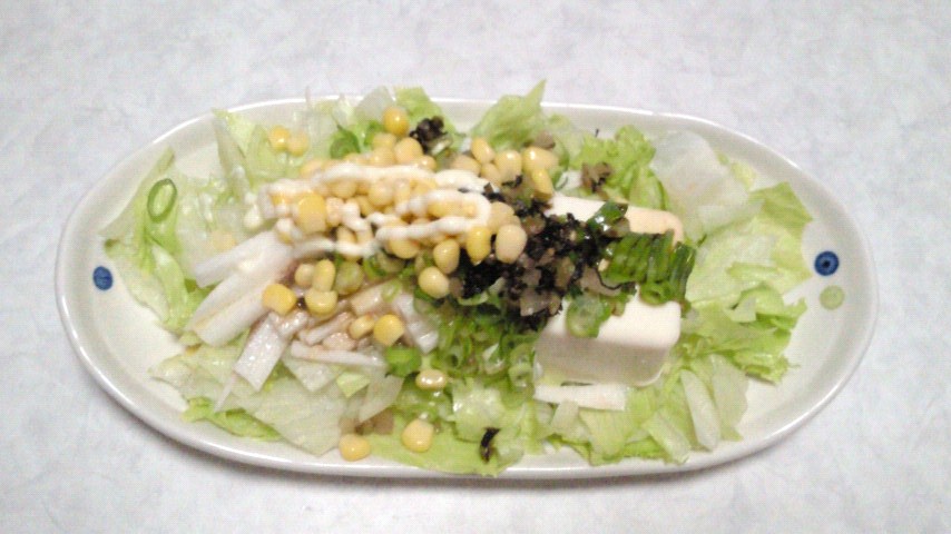 豆腐70g、長いも50g、レタス100g、ホールコーン15g、漬物10g、マヨネーズ3g、ゴマ油、酢、醤油