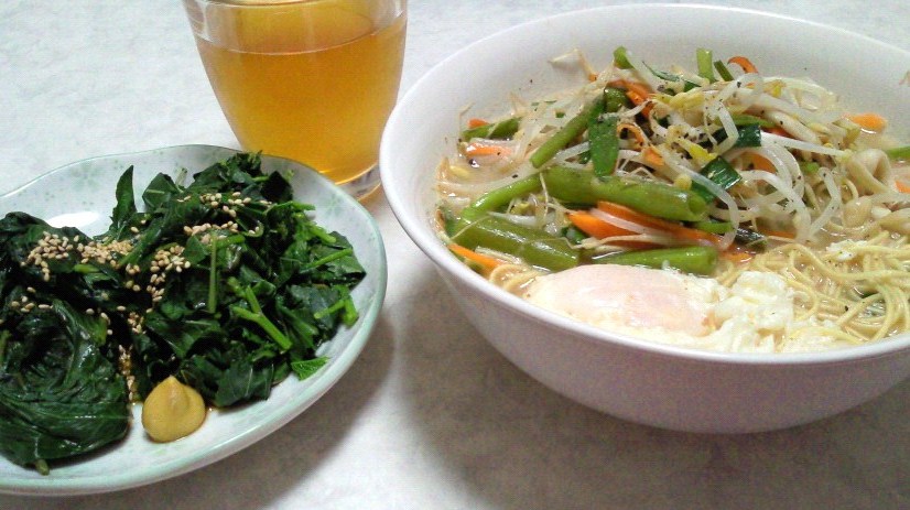 豚骨ラーメン/モロヘイヤ/空心菜/ポン酢/ごま