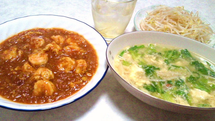えびのチリソース煮/レタスとえのきのスープ/もやしのおひたし/梅酒