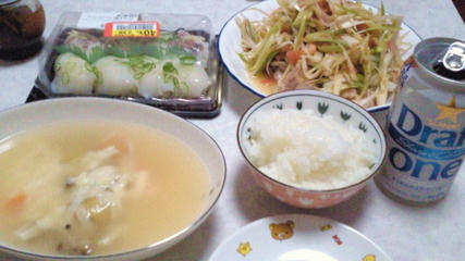 じゃがいもと人参しめじのコンソメスープ/サッポロ ドラフトワン350ml×3本