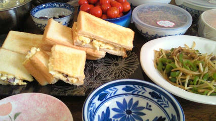 卵サンド/ごぼうのサラダ/味噌汁(じゃがいもとたまねぎ)/ピーマンともやしの炒め物/