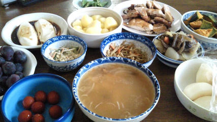 チキンソテー/粉ふきいも/かぼちゃの田舎煮/なし/梅酒/焼酎