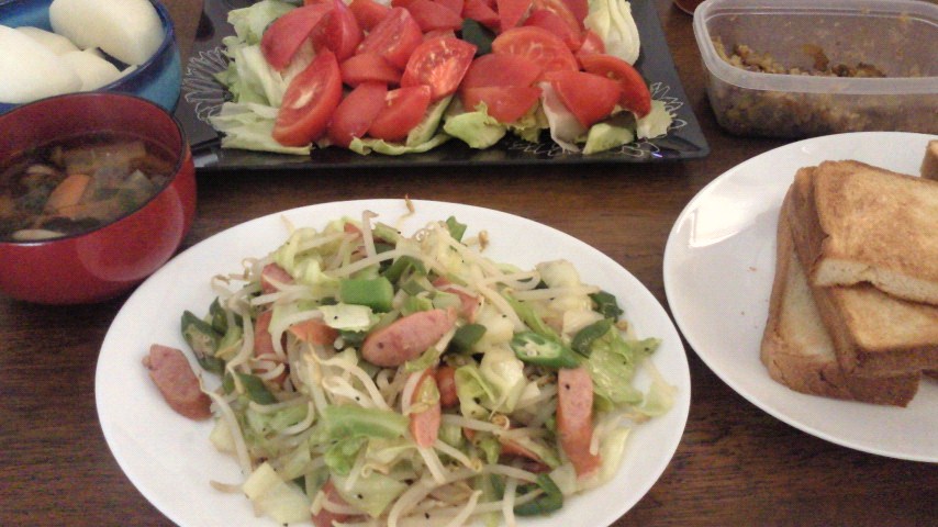 食パン(5枚切)/肉野菜炒め/生野菜サラダ/味噌汁/なし/ゴーヤチャンプルー